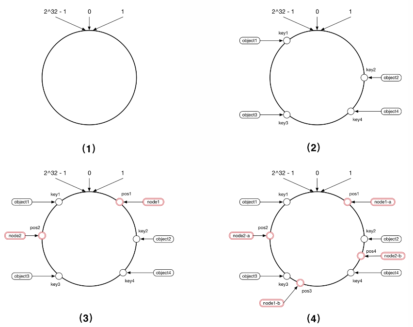 如上图所示,一致性哈希算法会在根据每条记录的内容计算出Hash值,然后把Hash值映射到一个环上的一点,然后将这个环分成若干个连续的区间,每个区间对应一个计算节点。落到同一个区间上的点(对应一条记录)都存储在同一个计算节点上面。这种算法最大的优点在于,当新增一个节点的时候,只有一小部分数据需要转移。
