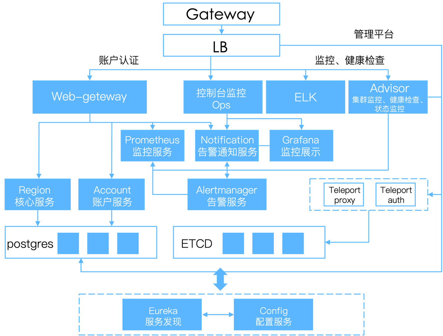 | postgreSQL | 存放account、region(集群状态等信息)、prometheus、notificatin、grafana等服务的数据 |